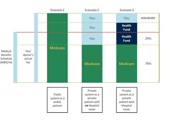 Scenario 2 - If you have no private hospital cover you can elect to have your operation sooner in the private system, but while Medicare will pay for 75% of the Medicare Benefits Schedule (MBS) fee for your medical costs, anything over that plus all hospital costs are payable by you. This could add up to thousands of dollars.